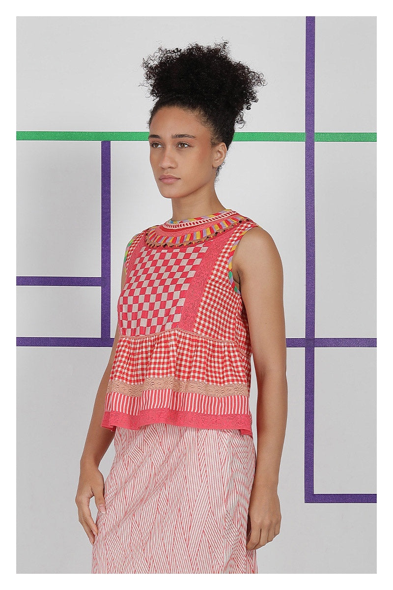 A vibrant, sleeveless peplum top that blends playful patterns with artisanal details. Features a high, ruffled neckline with intricate multi-color embroidery. The body of the top showcases a dynamic mix of pink/red and white checkered patterns, complemented by a striped fabric band at the waist. The peplum silhouette offers a flattering and comfortable fit.