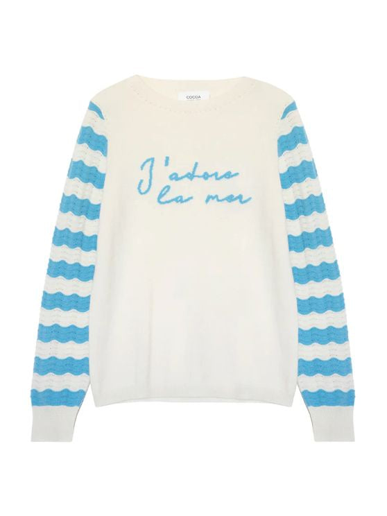 The La Mer Jumper is a soft, classic cashmere knit designed with a flattering silhouette and comfortable sleeves. Playful “J’adore la mer” lettering and subtle wave-inspired stripes along the arms add a cheerful, whimsical touch. Crafted from 100% cashmere in Natural White, it offers exceptional softness and warmth, perfect for effortless layering or wearing on its own.