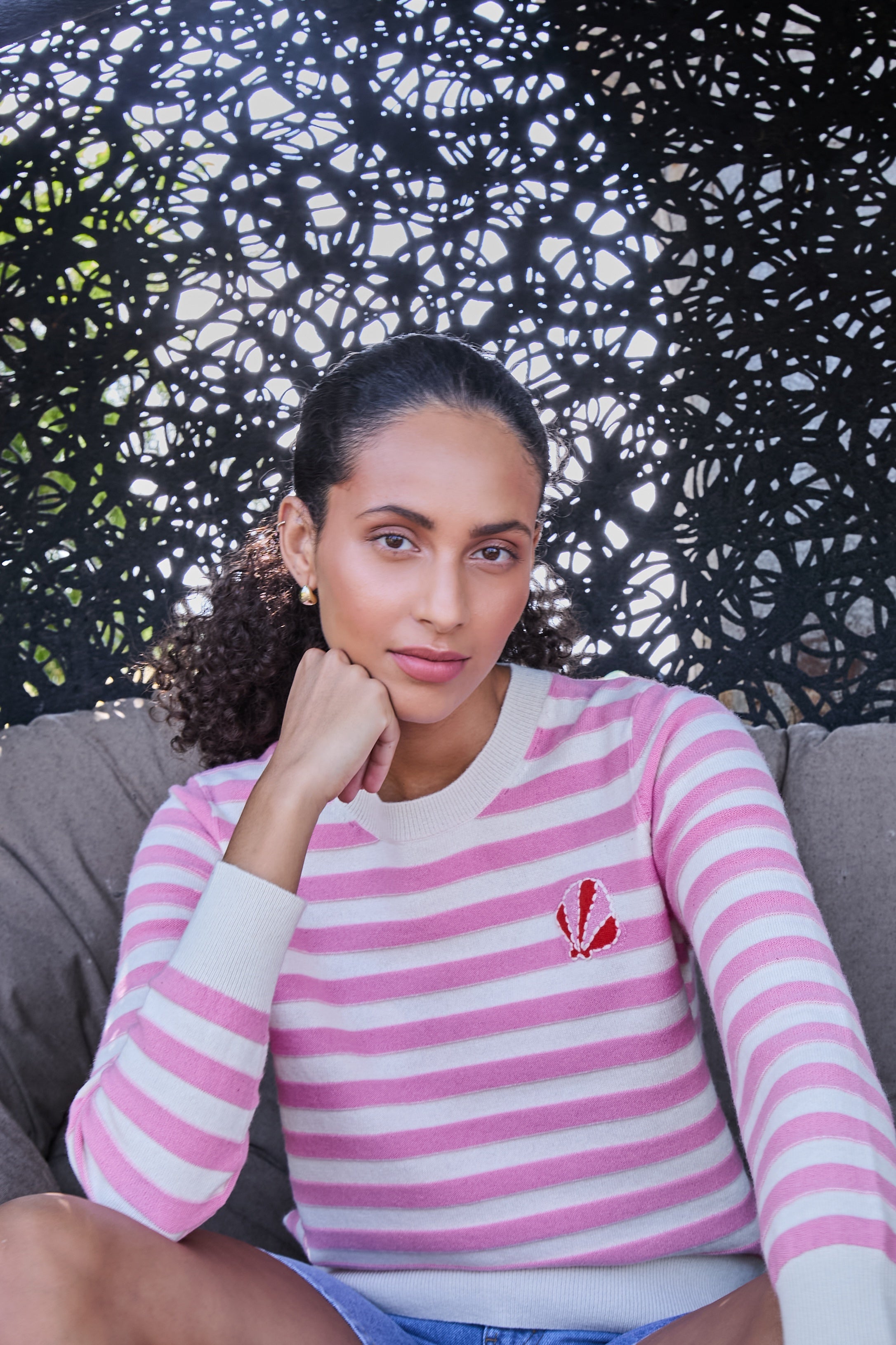 Features a classic crew neckline, ribbed trims, and soft pastel pink and white stripes. A delicate heart motif on the chest adds a subtle, playful finish. Comfortable for layering or wearing on its own for an effortless everyday outfit.