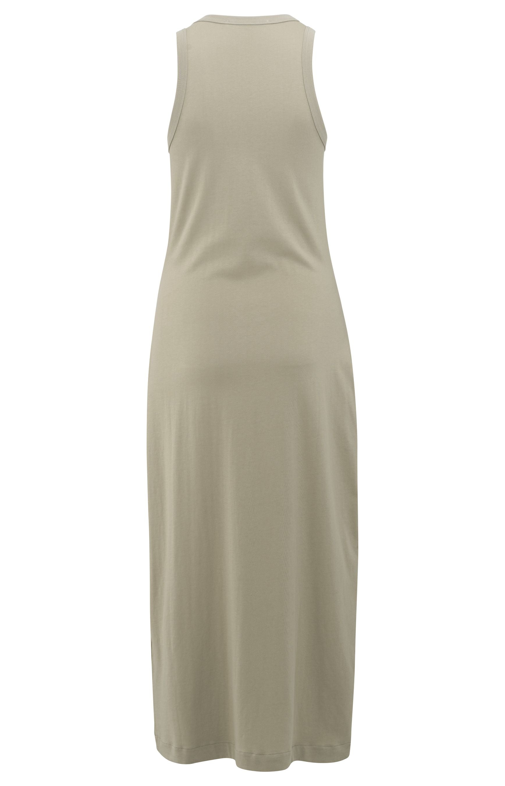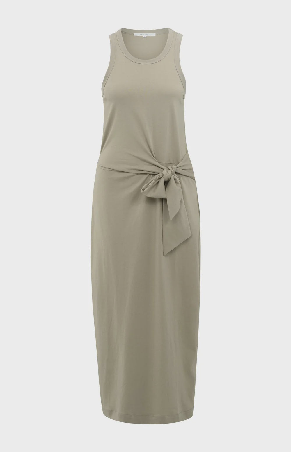 Breathable cotton for all-day comfort. Designed with a classic round neckline and a gently fitted silhouette, it flatters the figure with ease. A playful tie detail at the waist adds a feminine touch, while the midi length offers effortless versatility for warm, sunny days. A refined yet relaxed piece that transitions beautifully from casual outings to daytime events.