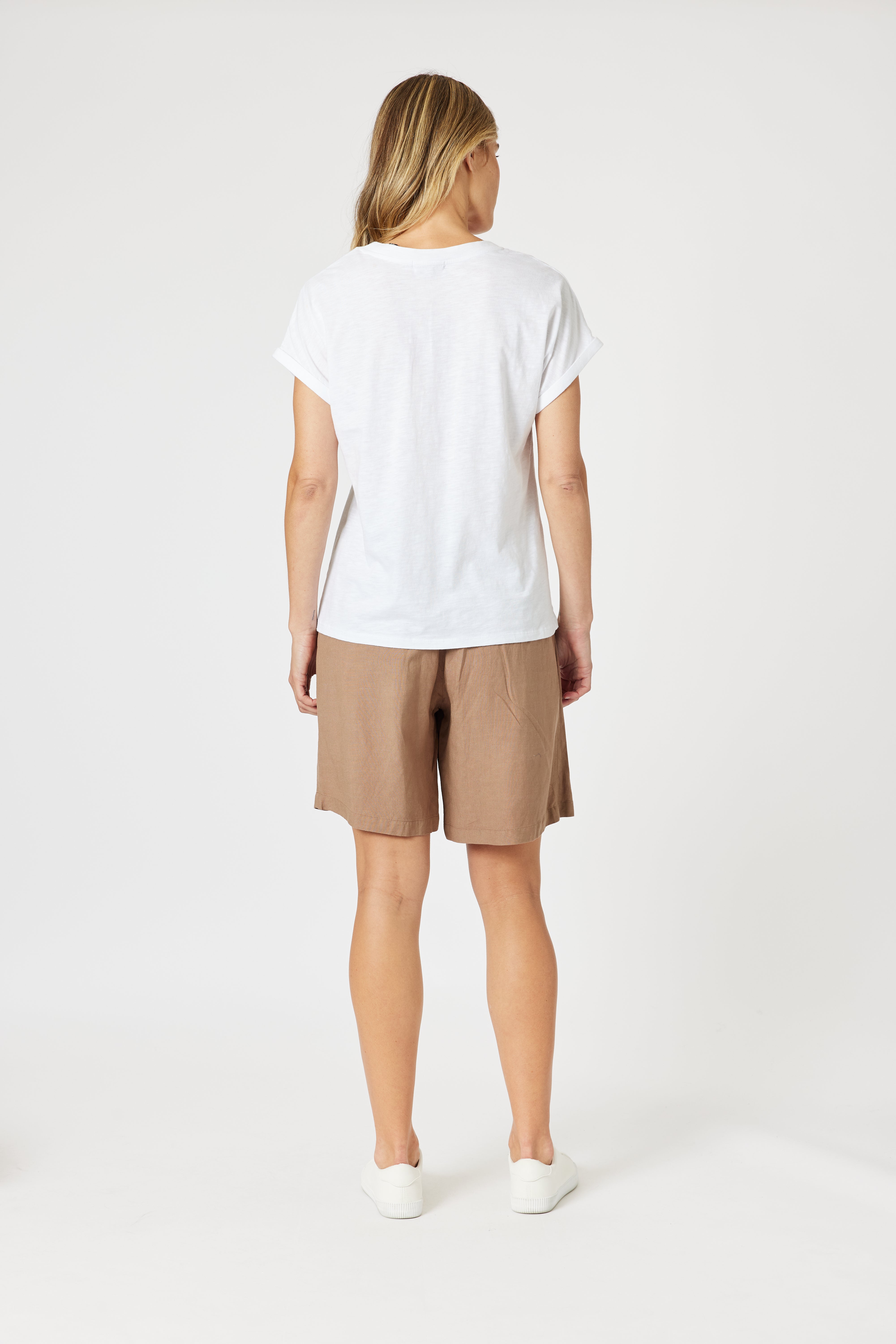 The knee-length cut offers just the right amount of coverage while maintaining a relaxed, modern silhouette. Functional side pockets and belt loops blend practicality with style, while the soft, lightweight fabric ensures all-day comfort. Perfect for travel or everyday wear, these shorts embody ease and effortless sophistication.