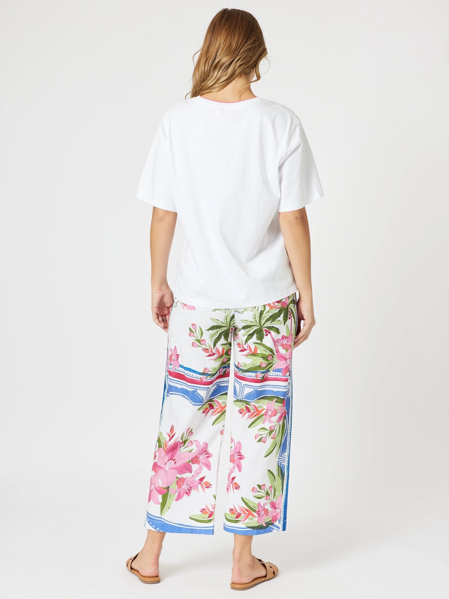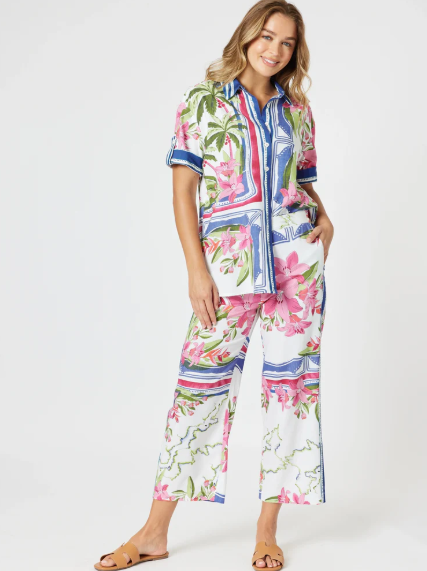 A celebration of colour and coastal ease, the Monaco Print Pants blend bold pink florals with nautical stripes in shades of blue and raspberry. Crafted from airy, breathable fabric, the relaxed wide-leg silhouette and flat front waistband create an elegant yet effortless look — ideal for seaside strolls or summer soirées.