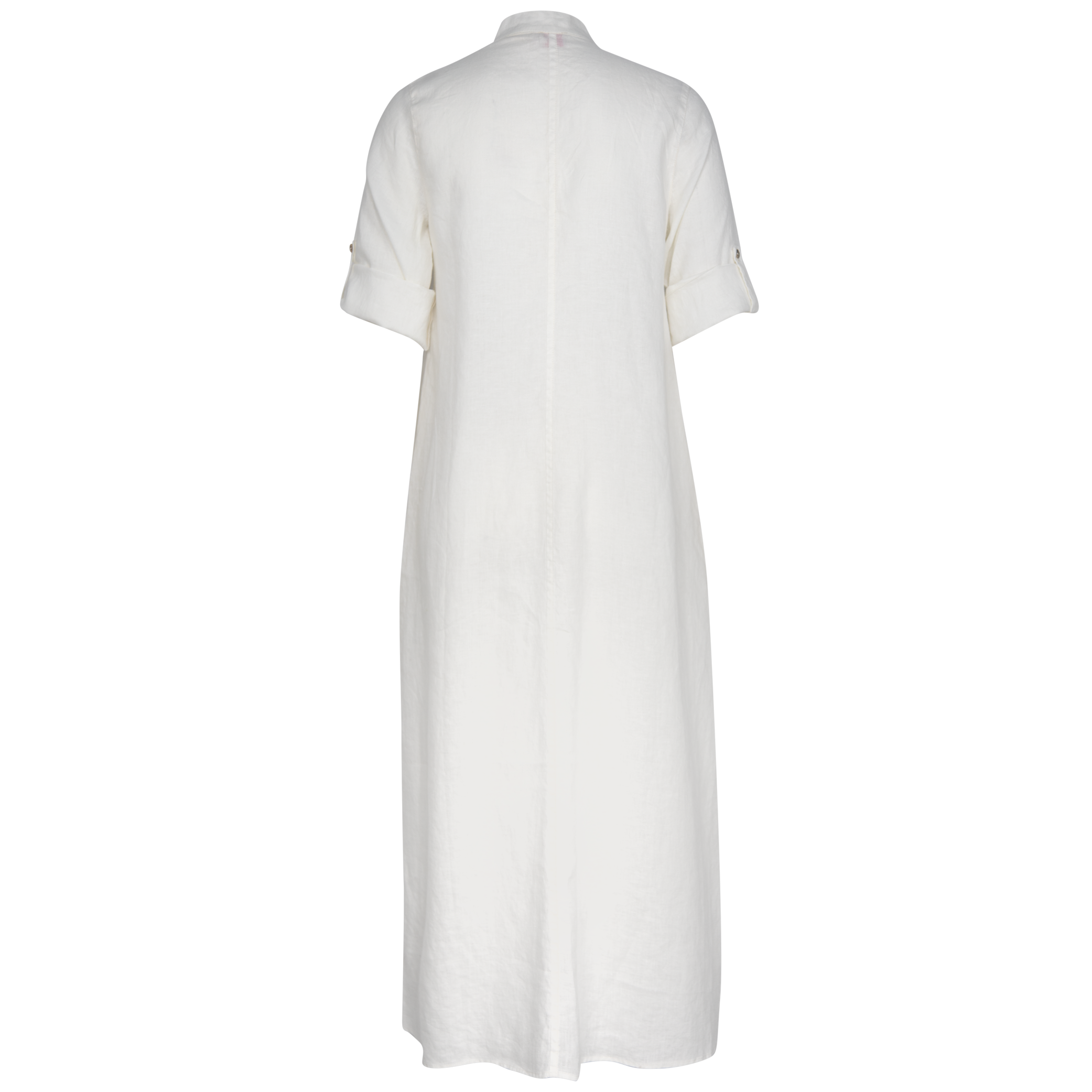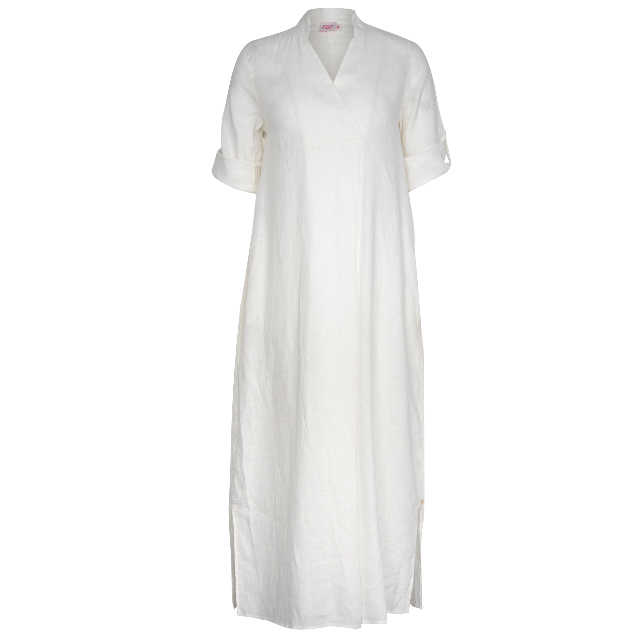 Beautiful 3/4 sleeve linen Stephanie Maxi dress feature a lovely deep V-neck opening.The collar is a simple, low -standing band collar that does not fold over and it forms a V-shape at the front  neckline, soft vertical pleat and side pockets.