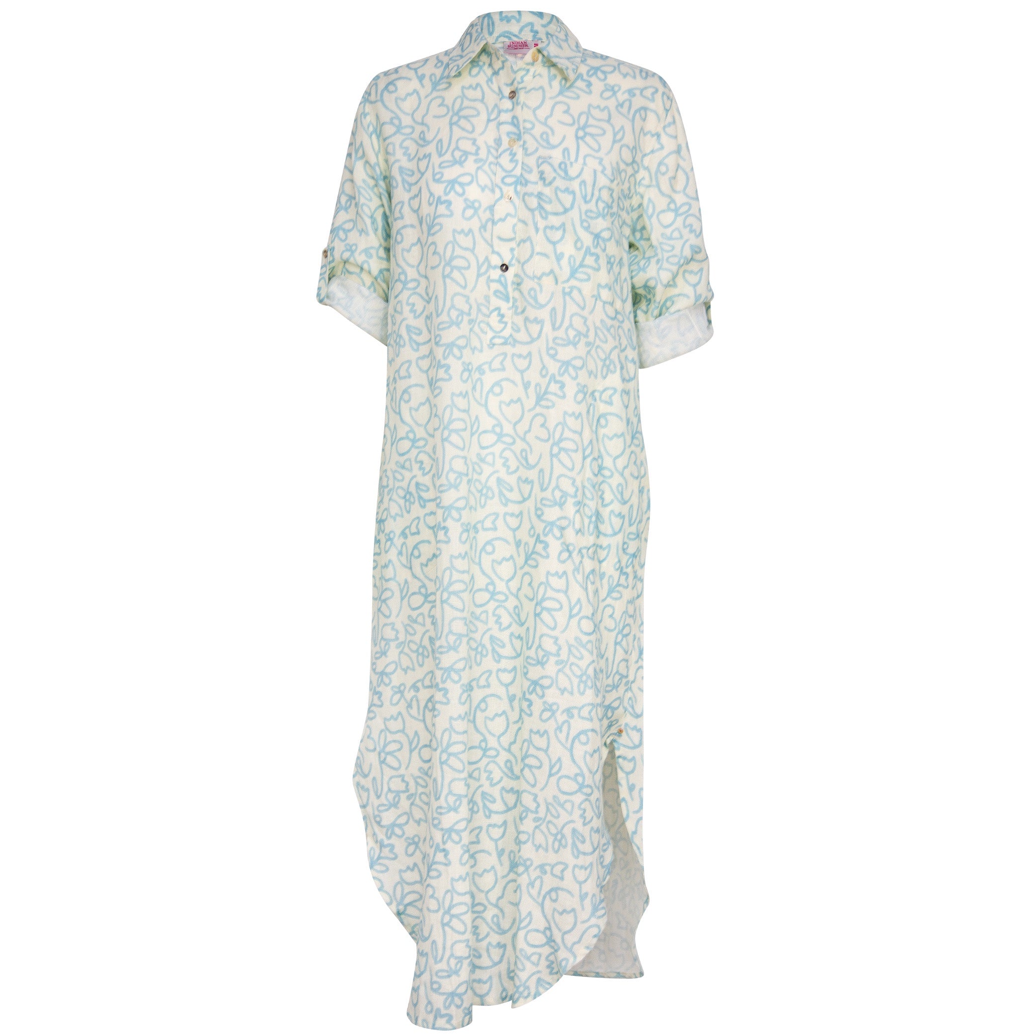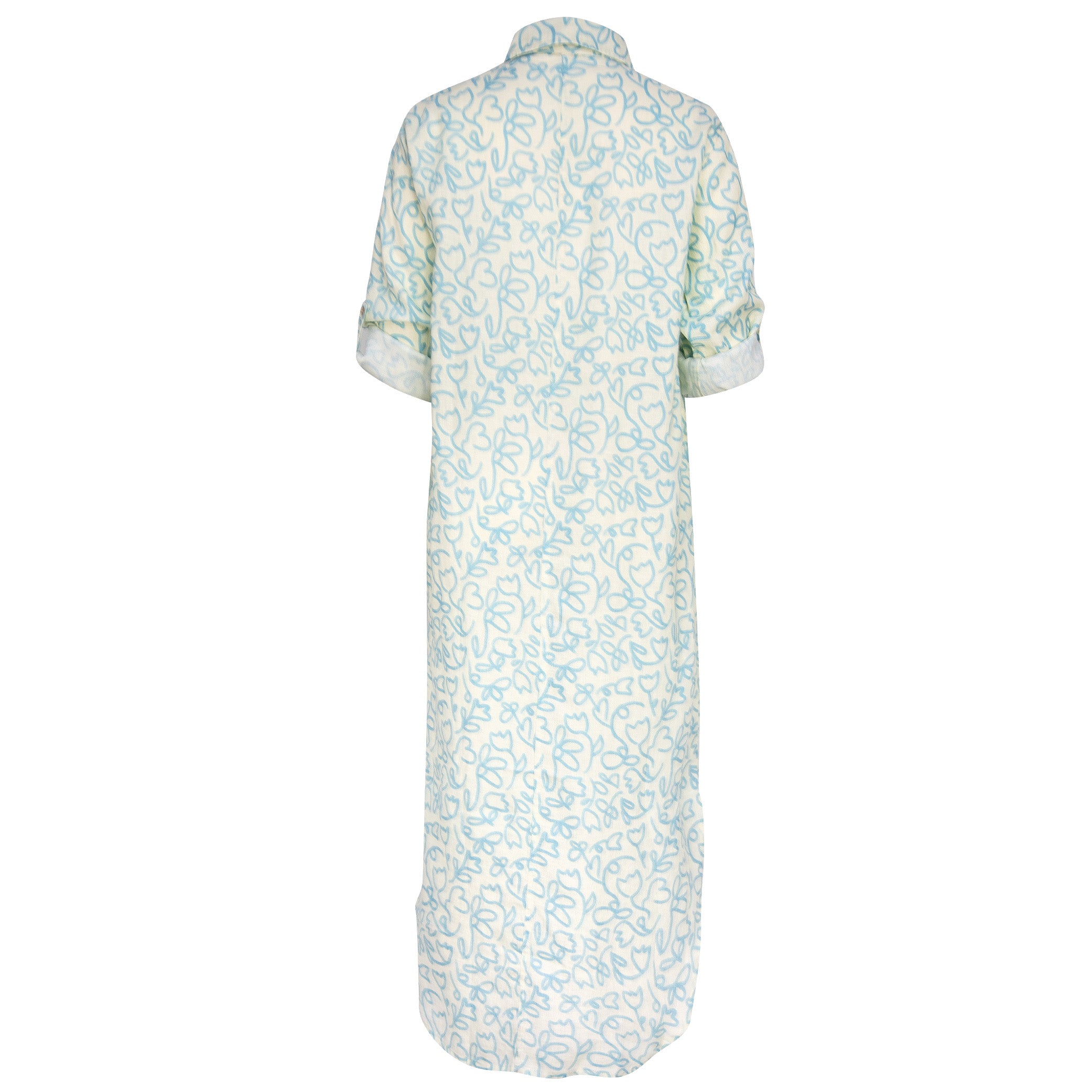 Embrace effortless elegance with the Melissa dress. Crafted from 100% Linen, it features a classic shirt collar, a partial button-front placket, and a relaxed fit that drapes beautifully. The long, flowing silhouette is complemented by rolled-up sleeves for a casual, versatile look. Perfect for warm days, this dress pairs effortlessly with sandals for a daytime outing or dressed up with heels for a chic evening look. The soft, blues adds a romantic, feminine touch. 100% linen Print Hand wash