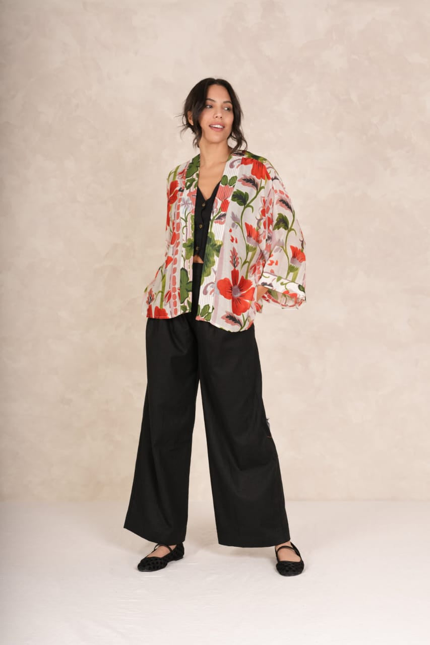 Our bestselling kimono jackets have loose ¾ length sleeves, an open front and a lightly embroidered lapel. Pair with a matching camisole and your favourite jeans in summer or layer over a polo neck during the cooler months.