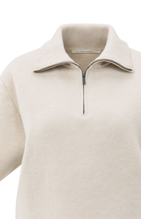 This sweater features a relaxed fit with short sleeves and a high ribbed collar. The half-zip closure adds a sporty touch, while the soft fabric ensures all-day comfort. A contemporary essential that transitions effortlessly from casual to stylish looks.