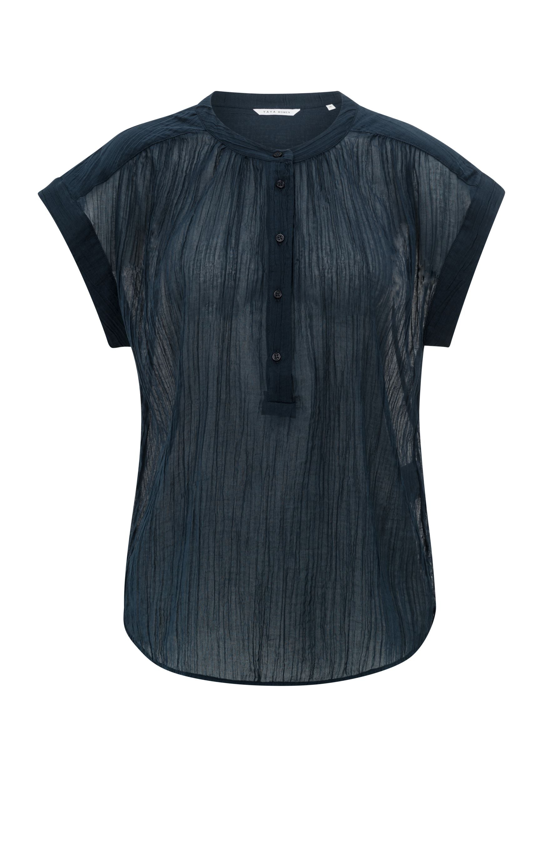 Crafted from a lightweight, semi-sheer fabric with a refined, textured finish. It features a short button placket, a rounded polo collar, and cap sleeves that create an easy, relaxed fit. Soft pleats at the back add a subtle feminine touch, making this the perfect piece for an effortless, elegant everyday look.