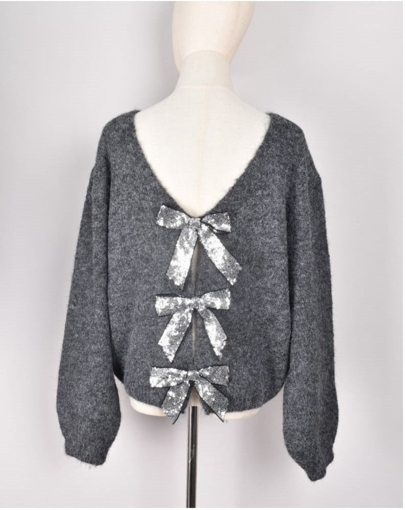 his chic cropped jumper is defined by slouchy raglan sleeves, all-over rib stitching and coloured flecks to the knit.Oversized jumper in a soft, fluffy knit .Round neckline, dropped shoulders and extra-long sleeves . With open back and 3bows that run along the your back.