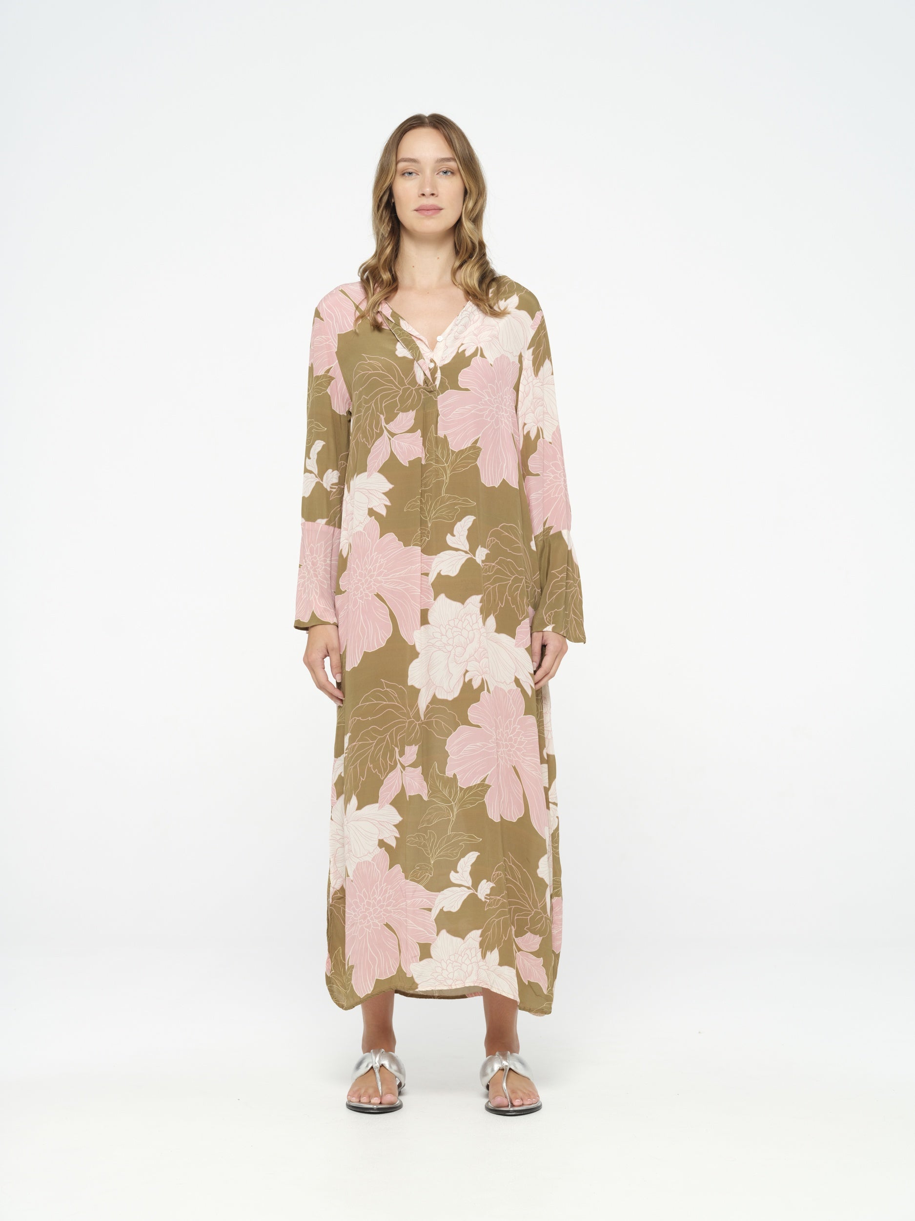 The style embraces a straight silhouette for timeless elegance. This maxi features a soft round neckline and fluted cuffs.