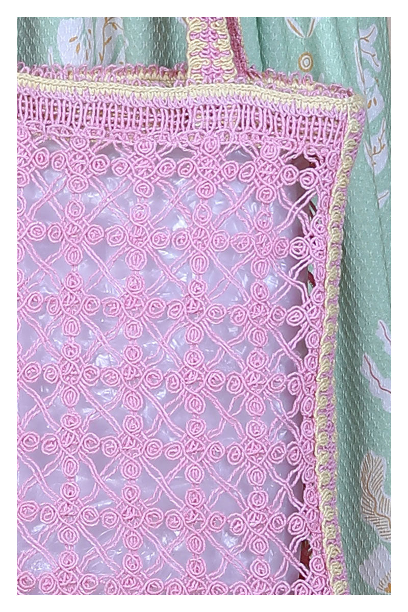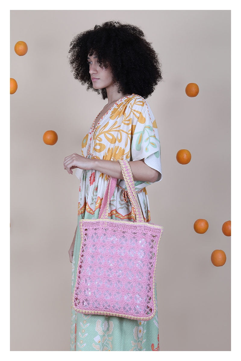 This adorable Serana tote bag is a delightful blend of playful charm and bohemian flair. Crafted with intricate detail, the vibrant pink open-knit design adds a touch of whimsy, while the cheerful yellow trim provides a pop of sunny contrast. It is the perfect accessory for adding a cute, handcrafted statement to any outfit.